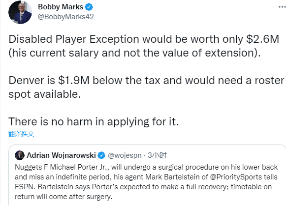 据名记沃纳罗斯基报道,小波特的经纪人表示预计他可以完全康复,大概伤停时间将在术后进行评估。如果联盟确认小波特赛季报销,掘金可以申请260万美元的伤病特例。