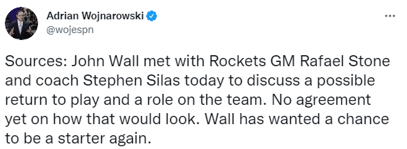 ESPN名记沃纳罗斯基报道,约翰-沃尔今天会见了火箭队总经理拉斐尔-斯通和教练斯蒂芬-赛拉斯,讨论了重返赛场和在球队中的角色;沃尔希望首发出战,双方未就沃尔在球队的角色定位达成一致。