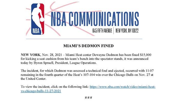 NBA官方宣布,热火球员戴德蒙应将坐垫踢上看台,被联盟罚款1.5万美元。