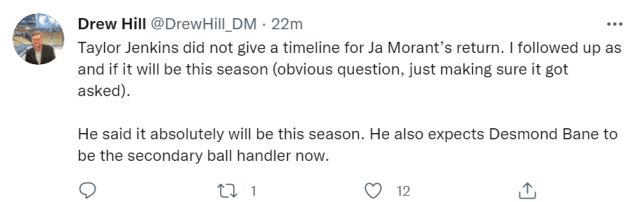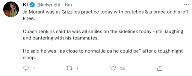 有记者拍下莫兰特的最新照片,他拄着双拐站在底线和队友交流,,左膝上安有支架。主教练詹金斯表示,莫兰特全程面带微笑,和队友们开着玩笑,和往常一样。他的回归暂时没有时间表。有记者问詹金斯:莫兰特能否在本赛季回归?詹姆斯的回应是:当然会在这个赛季回来。他计划让贝恩担任球队的第二控球手。