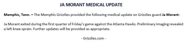 对老鹰一战,第一节还剩3分12秒的时候,灰熊半场进攻,莫兰特带球试图突破赫尔特的防守。就在他启动突破时,科林斯前来包夹,莫兰特往边线带球,随后就只能单脚跳着。当时前方报道称,莫兰特被搀扶回更衣室,左腿已经不能受力,显得非常痛苦。