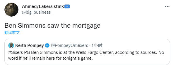 76人记者Keith Pompey报道,76人后卫本-西蒙斯出现在富国银行中心,但没有消息说他是否会留在这里参加比赛;对此有球迷调侃:西蒙斯看到了抵押贷款。