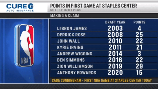 美媒列出现役多位状元职业生涯首次在洛杉矶斯台普斯球馆的得分——03年状元詹姆斯4分、08年状元罗斯25分,10年状元沃尔22分,14年状元维金斯3分,16年状元西蒙斯22分,19年状元锡安29分和20年状元爱德华兹15分。