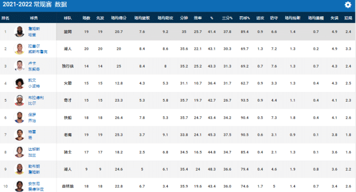 来源:24直播网11-26 14:4424直播网11月26日讯 新赛季NBA出色进行了接近四分之一,球员们的表现各有千秋,截止到目前,库里领跑场均得分榜、戈贝尔位居篮板榜第一名,保罗成为唯一一名场均助攻上双的球员。而在失误的榜单上,有不少的巨星在列,其中篮网的哈登和湖人的威少处于领跑的位置。