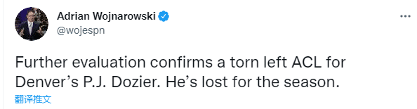 来源:24直播网11-25 15:3324直播网11月25日讯 ,PJ-多齐尔的检查结果正式出炉,丹佛掘金官宣,多齐尔遭遇左膝前交叉十字韧带撕裂,被列为无限期缺战,将缺席本赛季剩余比赛,确定赛季报销;悲剧,25岁多齐尔惨遭重伤,合同年遭此大伤,真是太不幸了。