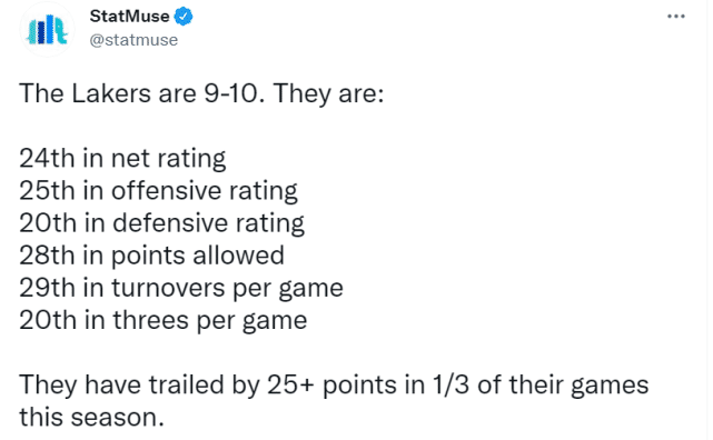 美媒扎心湖人:三分之一比赛至少落后过25分 六大数据排名倒数!