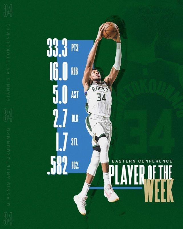 上周,字母哥帮助雄鹿取得3胜0负的战绩,他场均贡献33.3分16篮板5助攻1.7抢断2.7盖帽,投篮命中率58.2%,三分命中率36.4%,表现相当全面。这是雄鹿本赛季首次拿到三连胜,字母哥是最大的功臣。雄鹿官方晒图祝贺字母哥当选东部周最佳。