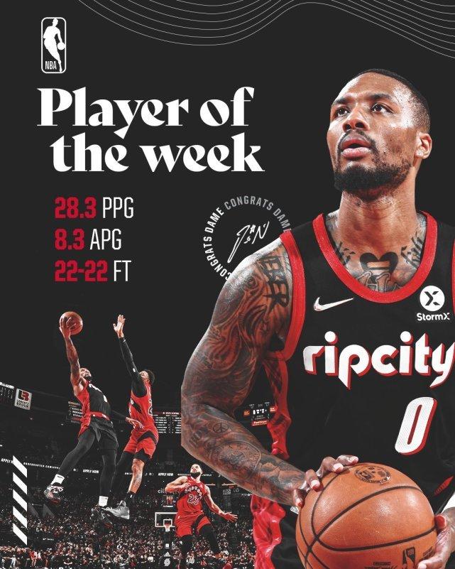 上周,开拓者取得3胜0负的佳绩,利拉德场均贡献28.3分2.7篮板8.3助攻,投篮命中率43.3%,三分命中率39.3%,罚球命中率100%(22罚全中)。开拓者官方晒图祝贺利拉德当选西部周最佳。利拉德13次当选周最佳,也是开拓者队史上最多的。