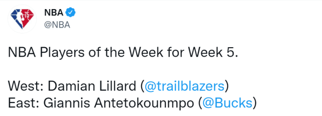 NBA官宣东西部周最佳!哈登普尔获提名,字母哥利拉德分别当选
