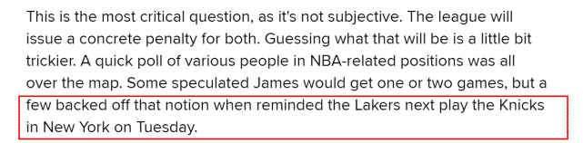知名美媒Bleacher Report(B/R)对此进行解析,他们指出有人猜测詹姆斯会因此被禁赛一至两场比赛,但当得知湖人下一场比赛是客场对阵尼克斯时,有些人放弃了詹姆斯会被禁赛的观点。如果詹姆斯因为禁赛而不能在麦迪逊广场花园打球,这是联盟无法接受的损失。