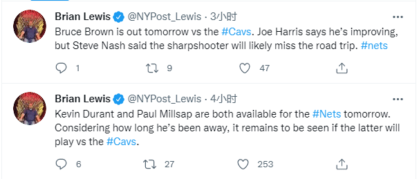 来源:24直播网11-22 11:3324直播网11月22日讯 ,篮网最新伤情出炉,据篮网记者Brian Lewis报道,杜兰特和米尔萨普复出,小布朗因腿筋紧张而缺战骑士,纳什还透露乔-哈里斯的伤情,至少再缺席两场比赛。