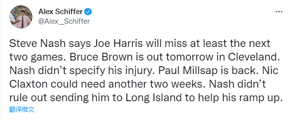 据篮网主帅纳什透露,乔-哈里斯将至少缺席接下来的两场客场比赛,布鲁斯-布朗(腿筋紧张)缺席明日与骑士一战;克拉克斯顿可能还需要两周左右时间复出,没有排除把他下放到发展联盟的可能性。