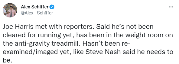 乔-哈里斯本人表示,他还没有被允许跑步,一直在进行力量训练,还没有进行重新的成像检查。