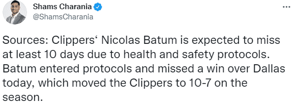 快船坏消息!名记曝:巴图姆触发健康与安全协议,确认至少缺席10天