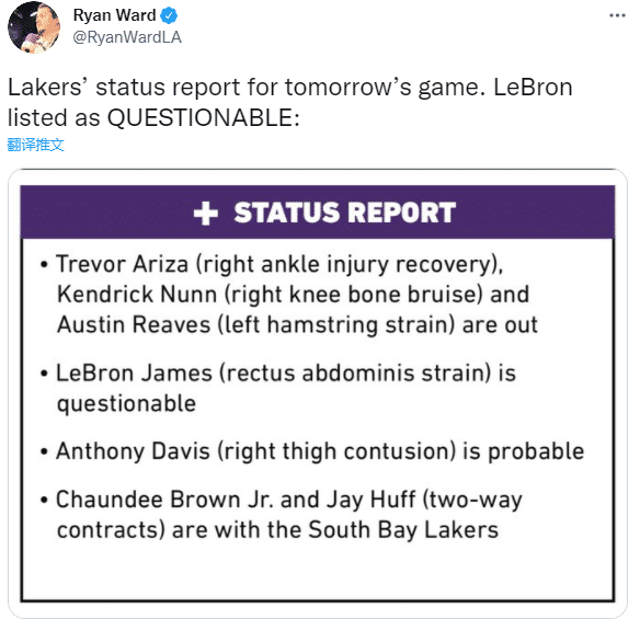 来源:24直播网11-21 15:5824直播网11月21日讯 ,湖人官方公布下一场对阵活塞的伤病报告,阿里扎、纳恩和里夫斯因伤继续休战,詹姆斯出战成疑,浓眉大概率出战,湖人伤病名单上还有5名球员,詹姆斯和浓眉依旧在列,