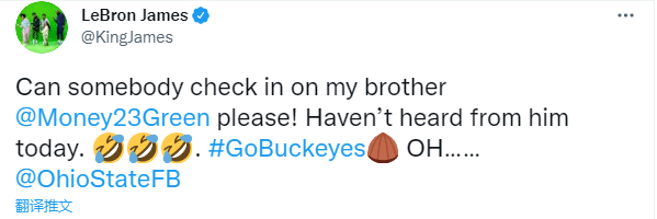 詹姆斯发推写道:请问,有人能帮我去看看我的兄弟格林吗?今天还没有听到他的消息。
