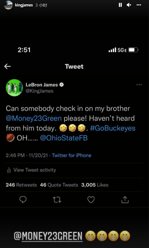 詹姆斯还在Ins上转发该条推文,艾特格林并且配上4个露齿笑的表情。