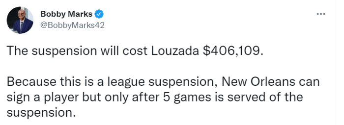 薪金专家鲍比-马克斯表示,洛扎达将因此损失的薪水是406109美元。因为这是联盟的禁赛决定,鹈鹕将被允许在禁赛执行5场后再签下一名球员。
