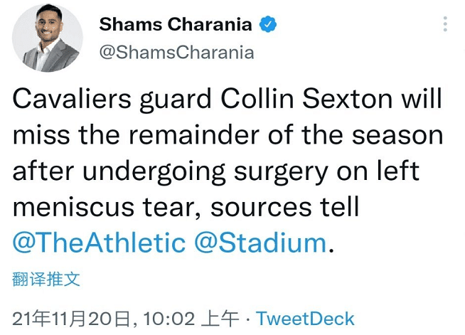 来源:24直播网11-20 15:1024直播网11月20日讯 今天NBA传来重磅消息,骑士球星塞克斯顿赛季报销。这是根据The Athletic名记Shams报道,塞克斯顿因为半月板撕裂,将接受修复手术,将缺席本赛季剩余比赛。本赛季他的数据是场均16分3.3篮板2.1助攻。