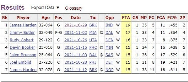 哈登单场20个罚球,刷新了本赛季联盟球员的单场罚球数纪录,之前也是他自己的记录(19个,2021年10月30日对阵步行者)。