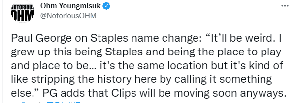 今天赢球赛后,乔治谈到斯台普斯球馆更名:我在斯台普斯中心长大,这里是我打球的地方。这肯定会很奇怪。这是同一个地方,但它有点剥夺了这里的历史…幸好我们不会在这里呆太久,我们有自己的球馆。