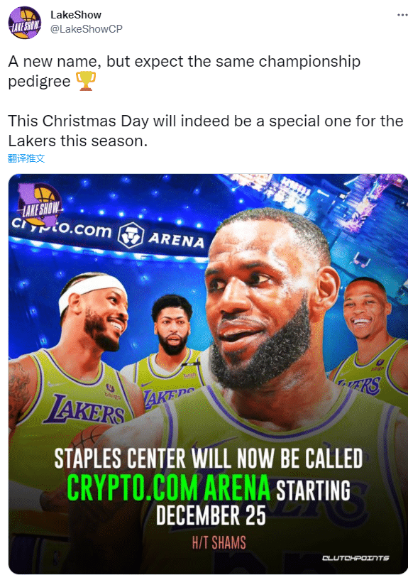 斯台普斯球馆将在12月26日正式更名为Crypto.com球馆,湖人圣诞大战篮网,这就是湖人在斯台普斯中心的最后一场比赛;届时球馆将换上新的LOGO以及元素,预计将在明年6月份,湖人球馆外的所有与斯台普斯有关的标志都会被换掉。