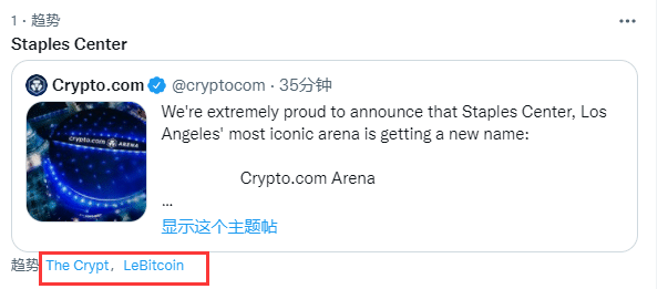 斯台普斯球馆的新名称是Crypto.com,这家虚拟货币交易公司总共花费超过7亿美元获得了湖人和快船主场斯台普斯中心的冠名权,这是美国史上最大的一笔球馆冠名权交易。