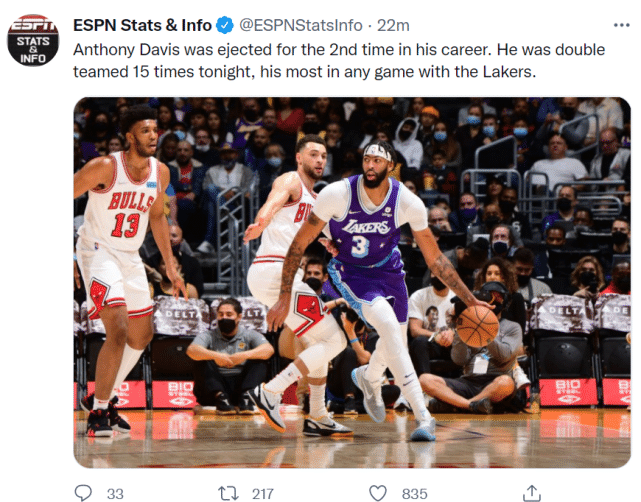 按照常规操作,裁判会等浓眉哥穿好鞋再把球给公牛队发球,结果裁判提前把球给了公牛队,导致场上湖人队只能4打5,这一幕也让浓眉哥非常不爽,向裁判抱怨,随后裁判给了浓眉哥技术犯规并将其罚下。