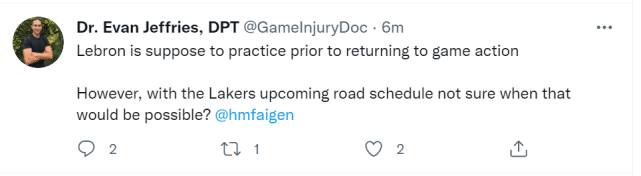 医学专家Jeffries表示,詹姆斯在复出前应该要参加训练,但问题在于湖人马上要开启一波客场之旅,不确定是否有时间进行训练了。打完公牛后,湖人要踏上客场之旅,8天内连续对阵5支东部球队。
