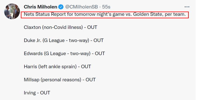 标注缺阵(OUT)状态的6人是克拉克斯顿(非新冠疾病)、杜克(参加G联赛)、爱德华兹(参加G联赛)、哈里斯(左踝扭伤)、米尔萨普(个人原因)和欧文。杜兰特没有出现在名单上,也说明他的肩伤无碍。