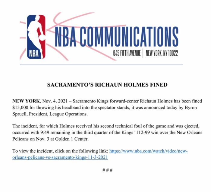 NBA官宣罚单!国王悍将怒扔发带被罚1.5万美元,不满判罚遭驱逐