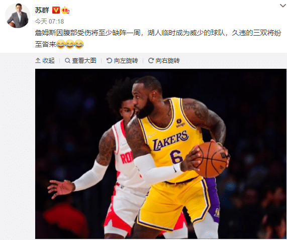来源:24直播网11-05 10:4424直播网11月05日讯 ,詹姆斯因腹部拉伤至少伤停一周引热议,国内名嘴苏群发微博点评:詹姆斯因腹部受伤将至少缺阵一周,湖人临时成为威少的球队,久违的三双将纷至沓来(三个笑哭表情)。