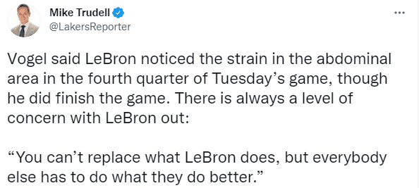 湖人队主教练弗兰克-沃格尔表示,湖人医务人员已经确定詹姆斯的腹部伤病与他在 2018-19 赛季的腹股沟伤势无关;沃帅还希望詹姆斯的伤势不严重,并且透露詹姆斯在上一场第四节注意到自己的腹部受伤,带伤打完比赛;对于詹姆斯缺阵,沃格尔表示:你不能取代勒布朗所做的,但其他人必须把他们的事情做的更好。