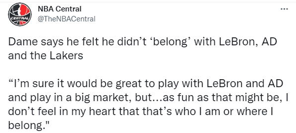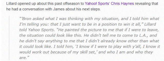 利拉德透露当时的一些对话内容,他表示:勒布朗问我对自己的处境有何看法,我告诉他就像我告诉你(海耶斯)的一样:我只想处于一个能够赢得一切的位置。他向我描绘了这样一幅图景,如果我离开,情况可能会是这样。他没有告诉我来洛杉矶,他只是说了可能发生的情况;我告诉他,‘我知道如果我和你们一起打球,考虑到我的能力,我知道我们会成功的;我知道我是谁,也知道他们是谁。