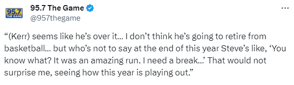 勇士记者Jason Dumas表示:昨日再次惨败后,我问科尔接下去的客场之旅球队是否会团结起来,科尔给我的答复只是‘我希望是’。科尔的给我的感觉仿佛就是他准备结束了,当然,我不认为他会退出篮球圈。但他的合同在今年夏天就要到期了。谁也不会怀疑科尔会在赛季结束时来一段‘你知道吗?这是一段了不起的旅程。但我需要休息一下。’的发言,科尔的成绩很好,但现在他该有的都有了,奥运会也打完了。看看今年勇士的情况,如果科尔真的决定离开一下,我不会感到惊讶。”