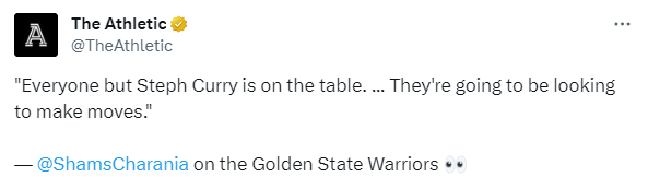 此前外界就曾报道勇士不会拆散库里、汤普森和追梦,到目前为止,库汤追已经带领勇士夺得四座总冠军,未来他们的球衣都可能被勇士队退役;如今名记曝勇士超市可能要开张了,除了库里之外,其他所有人都可能被交易。