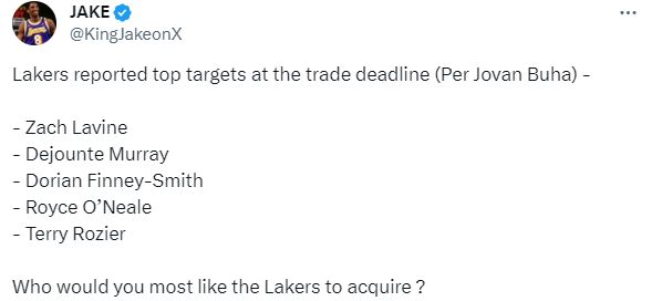 湖人五大潜在引援目标曝光,JovanBuha表示:湖人有很多需求,但是球队的进攻——尤其是三分投射和持球突破运动能力——是他们希望在下个月解决的问题。这可能会以一笔引人注目的交易的形式实现,比如拉文或德章泰-穆雷,或者是一笔规模较小的交易,比如芬尼-史密斯、罗伊斯-奥尼尔或特里-罗齐尔。湖人的进攻效率排名联盟第23位,这还不足以让他们赢得一轮季后赛,更不用说争夺总冠军了。湖人需要增加一两个球员来给他们停滞的进攻注入更多的活力。