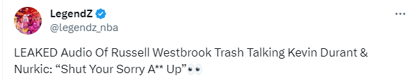 究竟威少和杜兰特、弩机都说了什么垃圾话?唇语专家曝光他们的对话内容——哈登持球突破造犯规后,威少站在替补席冲着努尔基奇喷垃圾话:你说你想干嘛?对不起,混蛋,闭嘴吧;努尔基奇回应:那就是他们让你替补的原因;威少:你TM的转过去吧。