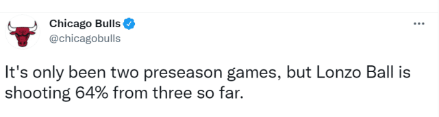 你没看错,球哥的三分命中率超过了六成,就是那个投篮姿势曾经被疯狂吐槽的球哥。两场季前赛后,他已经成为公牛最好的三分射手之一。两场比赛,他一共在三分线外出手11次,命中7球,准到令人难以置信。