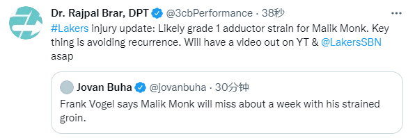 季前赛前三战,湖人遭遇三连败,比连败更糟心的是湖人队已经有三名球员受伤,阿里扎至少伤停8周,蒙克预计伤停一周,塔克的伤情还在评估中;医学专家Rajpal Brar分析蒙克的腹股沟伤情,应该是遭遇腹股沟一级拉伤,此种伤病的关键是预防伤势复发。
