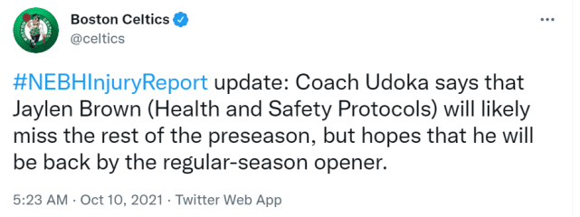 另外,绿军一天前官宣,杰伦-布朗新冠检测呈阳性,目前已经隔离,暂未出现相关症状。而上个月,主帅尤杜卡也曾出现新冠检测阳性的状况,当时,他表示自己感染前已经接种新冠疫苗,症状很轻微。上赛季,凯尔特人的另一位探花塔图姆也曾感染新冠,并影响到呼吸系统。
