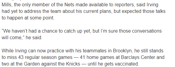 由于欧文一直没有接种疫苗,按规定他无法参加在麦迪逊花园球馆和巴克利中心的比赛,若欧文不改变决定,他将至少缺席43场常规赛;未来几天,欧文应该和篮网管理层会面,究竟篮网能否接受欧文“兼职”出战,我们拭目以待吧!