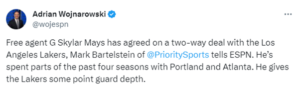 来源:24直播网01-09 16:3224直播网01月09日讯 ,洛杉矶湖人队又签一名球员,据名记woj报道,湖人用双向合同签下1米93后卫斯凯勒-梅斯,他为湖人提供了控卫深度;湖人全新14+3阵容出炉,詹姆斯和浓眉领衔冲击季后赛。