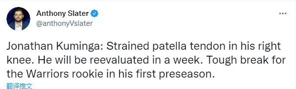 来源:24直播网10-08 11:2324直播网10月07日讯 ,勇士7号秀库明加的右膝检查结果出炉,据勇士随队记者Anthony Slater报道,库明加的伤情确诊为右膝髌骨肌腱拉伤。他将在一周内接受重新评估;勇士新秀在他的第一个季前赛中遭遇伤病太不幸了,至少伤停一周