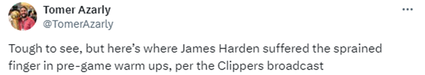 究竟哈登是怎么受伤的?据快船记者Tomer Azarly报道,在赛前热身时,哈登接球时不幸戳伤手指,右手食指扭伤仍佩戴护具坚持出战,因此在对阵黄蜂的比赛中,哈登上半场仅仅尝试了1次投篮没有得分进账,第三节才打进个人本场首球,全场出手3次贡献6分,得分不足助攻来凑。