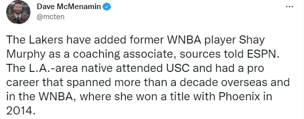 此外据NBA记者Dave McMenamin报道,前WNBA球员夏伊-墨菲(Shay Murphy)已以助教身份加入湖人教练组;夏伊-墨菲出生于1985年,是洛杉矶本地人,大学就读于南加州大学,2007选秀大会她在首轮第15顺位被明尼苏达山猫队选中。2014年墨菲随凤凰城水星队夺得WNBA总冠军。