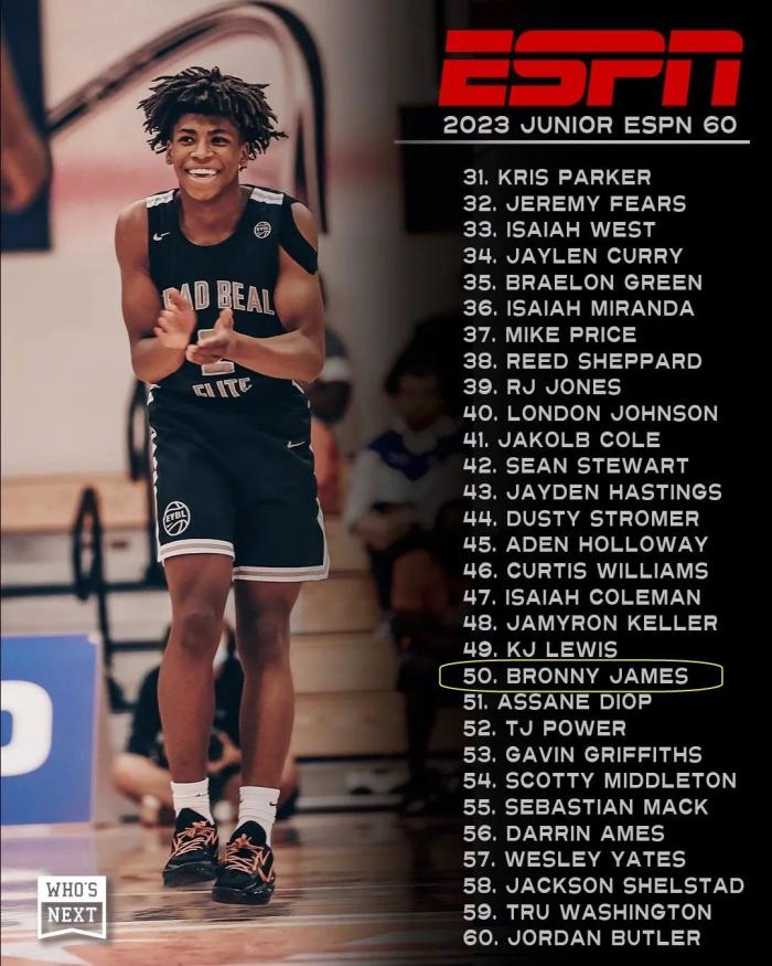 我们都知道,ESPN这份名单只统计全美同届的优秀高中生,如果再加上同期出色的国际球员,布朗尼的实力真得太不起眼了。每年的NBA选秀有60名球员被选中,算上落选秀等等,也就80人左右,假如今天选秀大会开始的话,布朗尼大概率落选。不得不说,和老爹詹姆斯相比,他的差距太大了。