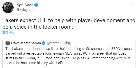 38岁的卢卡斯三世在17-19年担任森林狼助教,有很多教练经验,他将在湖人更衣室扮演角色,有助于和球员们建立联系,不过麦克马洪还提到他和詹姆斯之间有一些渊源。
