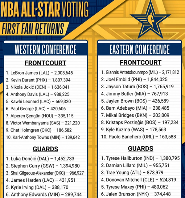 24直播网01月05日讯 NBA官方公布了2024年全明星首阶段投票结果,字母哥成为票王,他的得票数为2171812票,詹姆斯成为西部票王,票数突破200万。西部的后场竞争是相当激烈的,率队处于连胜的哈登也获得外界的肯定,他以431951票,力压欧文、爱德华兹和克莱等人,排名西部后场第四,重返全明星的可能性很大。