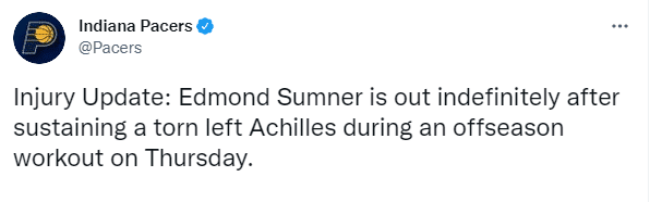 26岁的埃德蒙-萨姆纳是在训练中受伤的,不幸遭遇左脚跟腱撕裂的重伤,去年休赛期,勇士球星克莱-汤普森就是在训练中遭遇跟腱伤病,汤神因伤提前赛季报销。